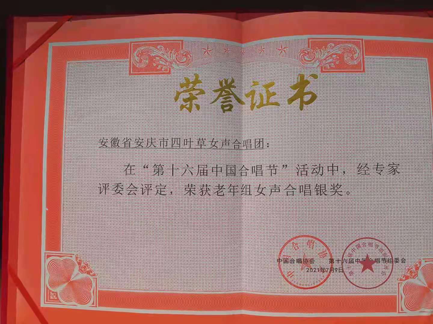 2021年7月5日至9日,以“颂歌献给党 启航新征程”为主题的第16届中国合唱节在湖北武汉市拉开序幕,来自全国20余省、市的82支合唱团,近5000人围绕比赛主题,高歌党的百年辉煌。365上市公司陈燕翔老师担任指导老师和合唱指挥的“安庆四叶草女声合唱团”在此次比赛中荣获老年组女声合唱银奖第一名。