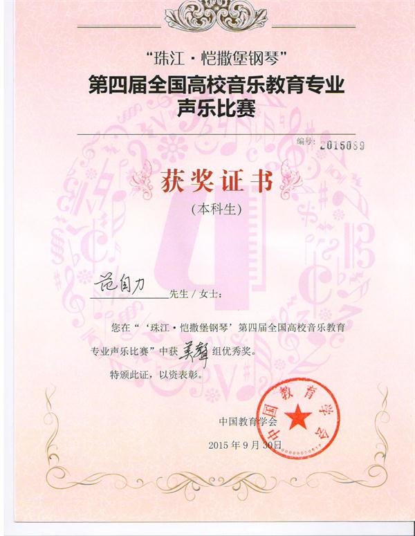9月30日,我院音乐学专业学生范自力在第四届全国高校音乐教育专业声乐比赛中获得本科生美声组优秀奖,这是我院学生首次在全国高校音乐教育声乐专业比赛中取得优秀成绩。