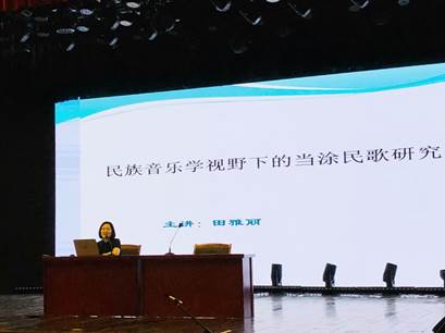田雅丽教授首先简要介绍了民族音乐学的概念、研究对象和研究理念,随后评述了当涂民歌的历史源流、总体特征和研究现状,最后向大家分享自己对当涂民歌进行田野调查、搜集整理、创作改编、演出实践的经验。田教授的报告既科学严谨,又活泼生动,她与师生分享了大量采风与演出的视频,更亲自范唱了两首当涂民歌,从而拉近了广大师生与民间音乐的距离,使我院师生深切地感受到了民间音乐的魅力。