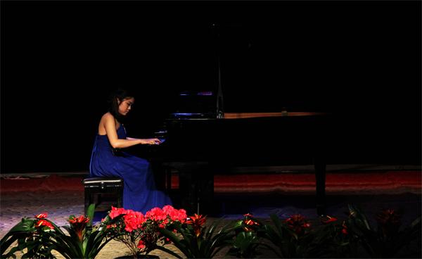 音乐会由《黄河船夫曲》序曲开始,由10级学生陈永霞演奏杨飞虎老师协奏,师生默契的配合把黄河钢琴协奏曲的前两个乐章呈现出来;11级戴心同学演奏了莫扎特奏鸣曲K.333和肖邦op.25.1“竖琴”练习曲,莫扎特中流露出“含着眼泪的微笑”,而肖邦中流露着一丝莫扎特般天使之歌;陈永霞演奏的2首肖邦《夜曲》一直给人宁静和优雅,使现场的观众们陶醉在优美的旋律和动听的和声之中。接下来在主持人杨顺的即兴演唱助兴后,由钟王君同学演奏了钢琴曲《浏阳河》,运用了变奏的手法,通过逐次加花的方式加厚旋律的线条,丰富的表现力使得现场达到第一次高潮。中场休息后,荣丽娟同学以饱满而又低沉的低音和弦组拉开贝多芬的《悲怆奏鸣曲》开始,全场瞬间安静,细细的聆听,观众仿佛能从他的悲怆中听到贝多芬再诉说他那坎坷不平的人生。车尔尼的八度练习曲时而像一首长号协奏曲,时而像一首轻快的波尔卡,进一步展现了演奏者技术。紧接着便是梁媛辰同学演奏的贝多芬的巨作《黎明奏鸣曲》,活泼的跳音,清晰的倚音,都在诉说这黎明前的欢乐,为我们探寻清晨森林里活泼欢乐的大聚会,鸟儿在歌唱,松鼠在跳舞,黎明的欢歌正在森林里唱响,台下的观众闭目在细细品味,如痴如醉。随后由陈永霞再次登台演奏了颇具难度的拉赫马尼诺夫前奏曲和肖邦谐谑曲,充分展现了浪漫派的激情与创新,拓展了琴的全新演奏技术,并将传统和声发展到极致。最后,杨飞虎老师弹了一首充满了梦幻色的李斯特夜曲《爱之梦》,杨飞虎老师技巧娴熟,感情细腻与琴声很好的交融在一起,音乐深情婉转、给人安静,使听者如痴如醉,陶醉在琴声里,台下观众听得如痴如醉,在观众经久不息的掌声中,音乐会圆满的落下了帷幕。整场音乐会结构构思巧妙,用纯钢琴演绎了多首不同风格题材的中外经典作品,精选的片头一首意大利情歌和片尾土耳其进行曲也给听众留下了深刻的印象。