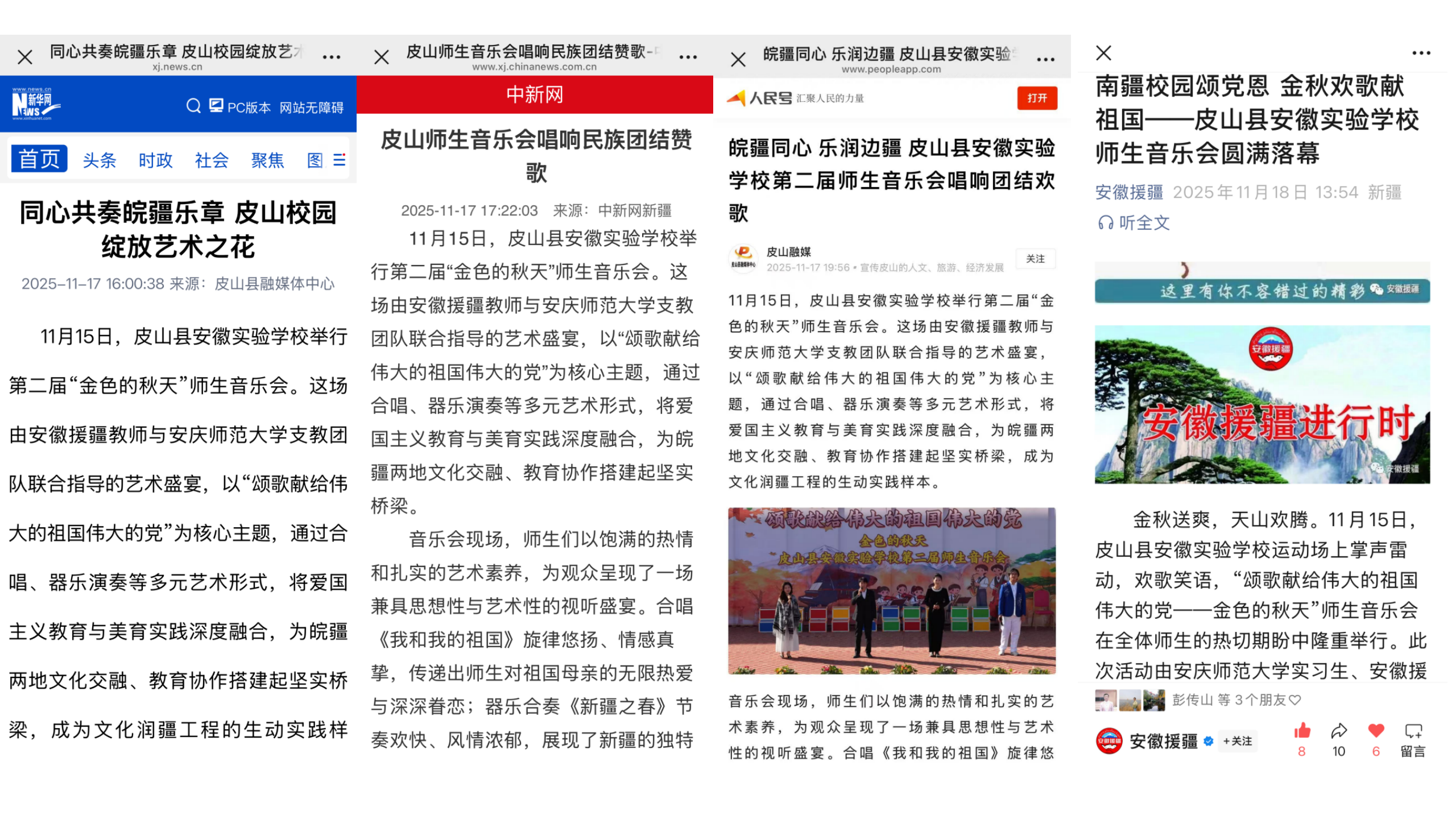 11月15日,由我院彭传山、魏星月、马凌云、喻心悦、陈帅等6名援疆支教师生组织并参演的“颂歌献给伟大的祖国伟大的党”——皮山县安徽实验学校“金色的秋天”第二届师生音乐会圆满落幕,反响热烈。新华网、中新网、人民网、安徽援疆网等媒体均对活动进行了报道,一致认为本场演出融合合唱、器乐演奏等多种艺术形式,将爱国主义教育与美育实践有机融合,为皖疆两地文化交融与教育协作搭建了坚实桥梁,是文化润疆工程的生动实践。