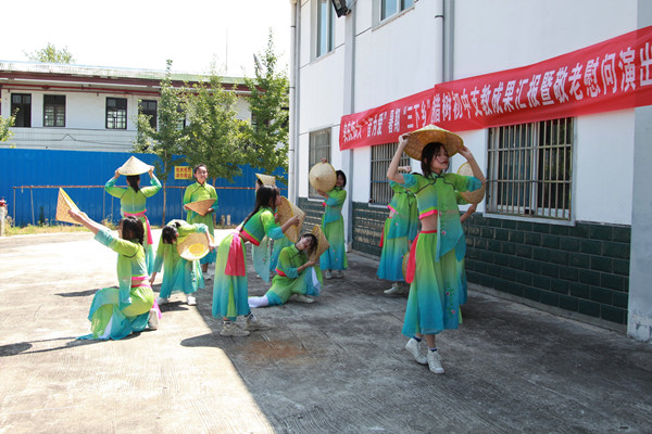 穿上青绿色薄衫,以粉色腰带点缀,“麻花”辫自然垂落,舞蹈组的数十名“留守”学生手持斗笠,表演舞蹈《田间斗笠》,展现了一幅农家少女劳作的场景。或绕圈旋转,或弯腰“采花”,伴随欢快的音乐节奏,姑娘们碎步前行、屈膝转向,整齐的列队四散,“戴帽”“擦汗”等动作“波浪式”交替推进,整齐中彰显着俏皮灵动。观看到这一幕,坐在观众席中的老人们脸上挂满笑容,不住地鼓掌。