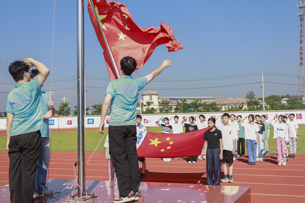 随着《出旗曲》的奏响,护旗手队伍从队列后方稳步前行,红色队旗倾斜45度,旗手紧握旗杆的双手稳健有力。全体少先队员齐刷刷举起了右手,五指并拢高举头顶,炎热的天气里,学生们标准的队礼传达出对少先队组织最纯粹的敬意。走过队伍中央时,护旗手身姿挺拔,目光坚定。在实践团的带领下,学生们齐唱《中国少年先锋队队歌》,声音稚嫩却充满力量,在操场上久久回荡。