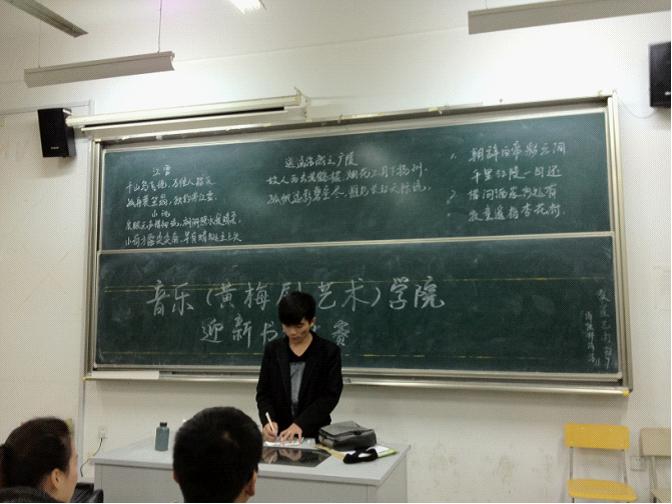 首先进行的是硬笔书法,由宣传部长黄子开在黑板写下参赛书写内容,参赛选手进行书写,由现场工作人员分发纸张后,同学们便开始伏案书写起来,选手们齐力投进,细心卷写,在小小的格子间挥洒卷写豪气。随即进行的是软笔的角逐,选手们铺好宣纸,拿起毛笔开始舞文弄墨,不一会儿,一个个或苍穹有力,或娟小秀气的毛笔字便呈现在眼前,在此期间,室外不时由过路的同学驻足观看,同学们为此更加兴致高涨。