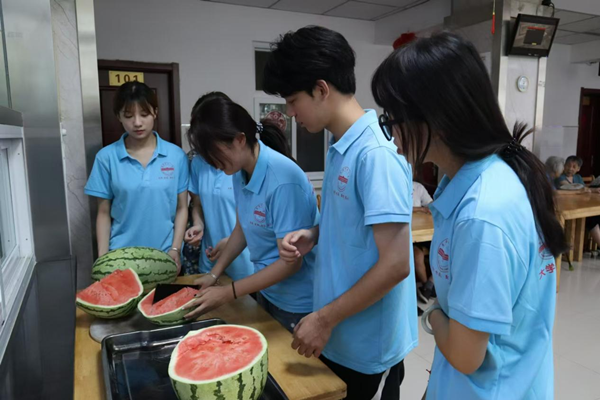 放好菜板、均匀切好、整齐摆盘……早在汇演开始前,实践团就买来西瓜,准备为老人们送上一份清凉。“正值夏日,西瓜就成了去敬老院慰问老人的最佳食品。”实践队员孙圣宇说到。他表示,此次是自己首次参加慰问活动,老人们的笑脸为自己的内心带来了快乐和满足,同时,慰问活动也丰富了自己的经历。